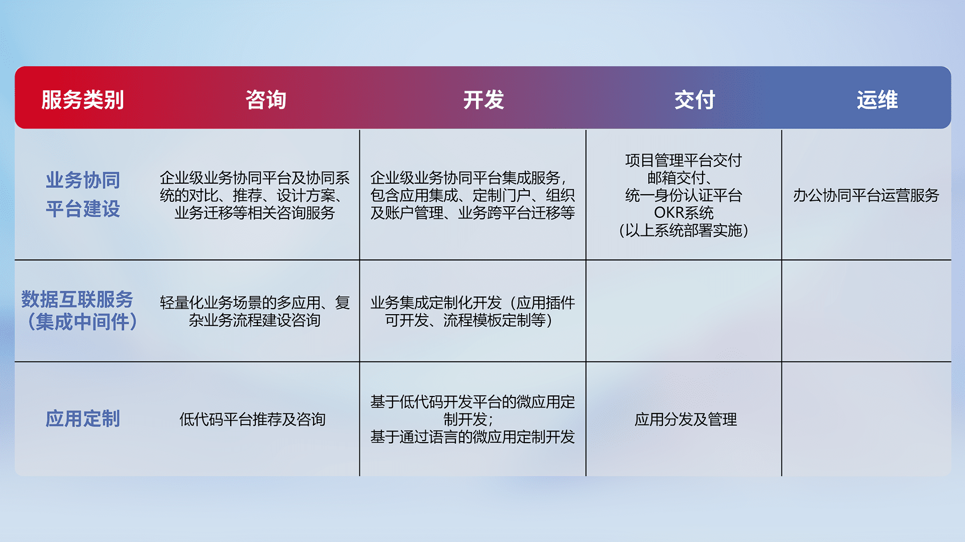 针对钉钉、、企微、、、、IDaas等平台级产品提供产品的规划、、方案、、交付、、定制化开发等服务,,,实现如统一协同办公、、、智能客户服务、、混合会议管理、、、智能数据查询、、、、等业务场景,,,,实现数字化转型。。