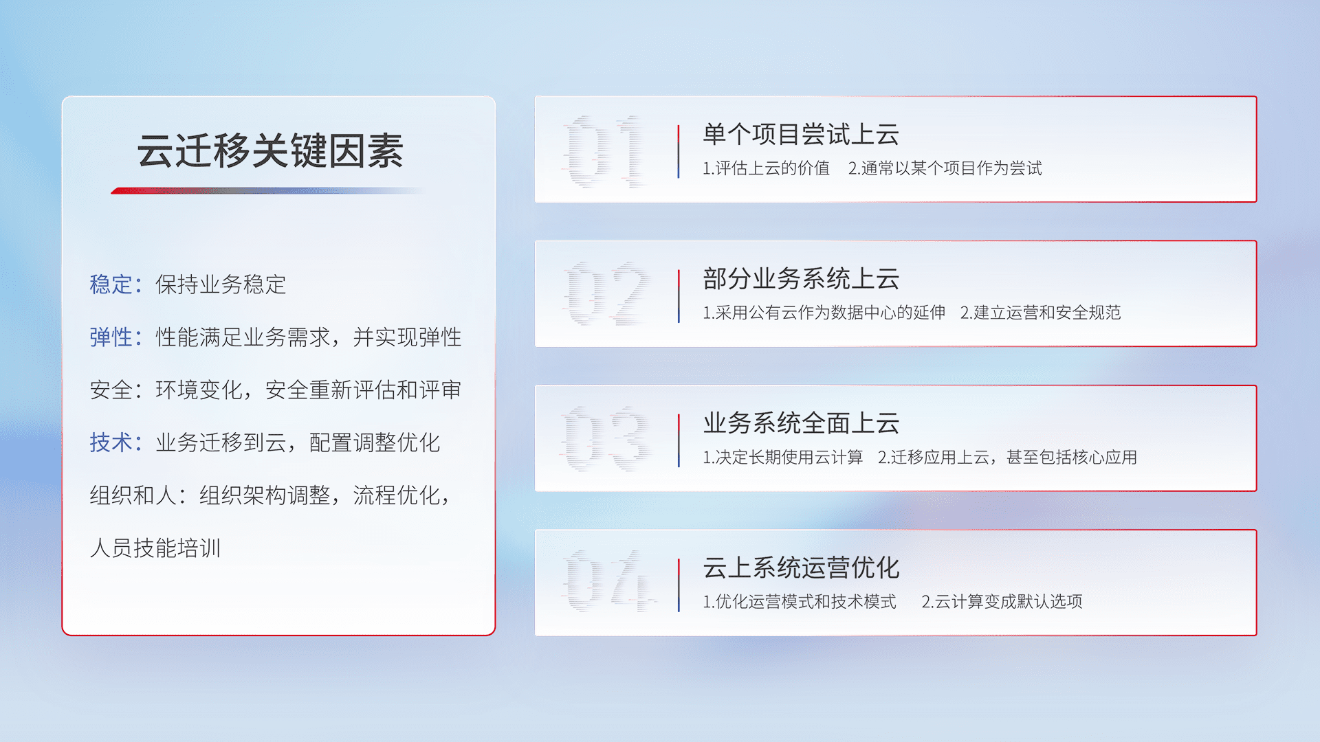 结合实际业务,,从规划设计、、云平台选型、、、云原生改造、、数据迁移、、、、集成交付,,,,迁移全过程为客户识别最佳上云路径,,,,做好风险识别管理,,,,设计网络架构、、、、身份权限、、、、安全审计合规、、、操作审计、、、、日志审计、、、、监控告警策略、、多站点容灾设计等,,对云上基础设施进行整体规划,,,提升IT治理水平,,,以满足弹性、、、高可用、、、高性能的需求。。
