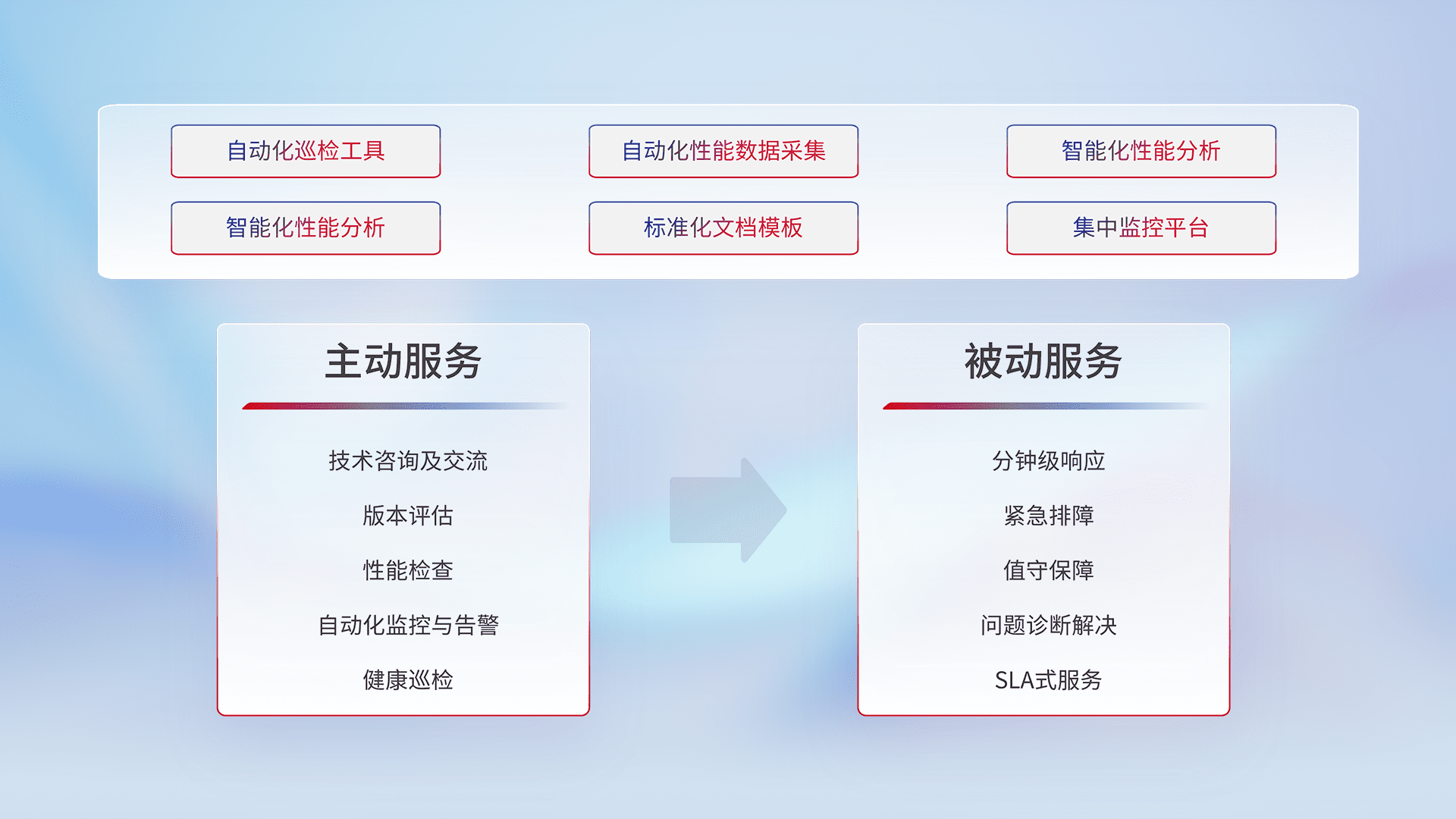 智能化工具和标准化文档,,保障服务质量,,提供主动服务(包含技术咨询、、、、版本评估、、性能检查、、、自动化监控与告警、、健康巡检)和被动服务包含(分钟级响应、、、紧急排障、、值守保障、、问题诊断解决、、、SLA服务)。。。